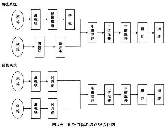 När polyester (eller andra kemiska fibrer) och bomull blandas, på grund av polyester- och bomullsfibrernas olika egenskaper och föroreningar, kan det inte blandas och bearbetas i kärleksbrevsprocessen, och det är nödvändigt att göra remsor av gitter, och sedan blanda på den första vägritningsmaskinen (blandning), för att säkerställa blandning krävs tre parallella remsor. Processflödet för allmän kamning och kamspinning visas i figuren nedan.