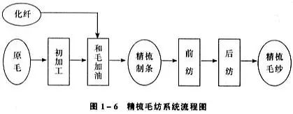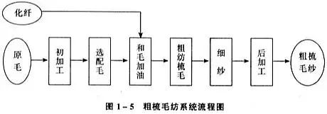 Det kammade ullspinningssystemet har många processer och långa processer, som kan delas upp i två delar: raka remsor och spinning, och spinningsystemets flöde visas i figuren nedan.