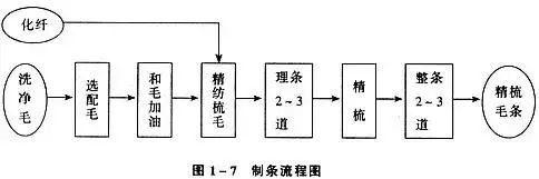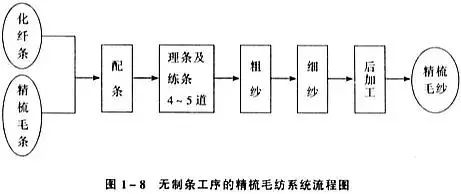Vissa kammade ullfabriker har ingen remsframställningsprocess, som använder kammade ullremsor som råmaterial, och produktionsprocessen inkluderar förspinning och efterspinning; De flesta fabriker har ingen färgnings- och kamningsprocess för bandfärgning och omkamning, vilket hänvisar till den andra kamningen efter färgning av ullen, och omkamningsprocessen liknar processen för framställning av band. Flödet av det kammade ullspinningssystemet utan en dubbel kamningsprocess visas i figur 1-8. Dessutom finns ett halvkammat spinnprocesssystem mellan kamning och kamning.