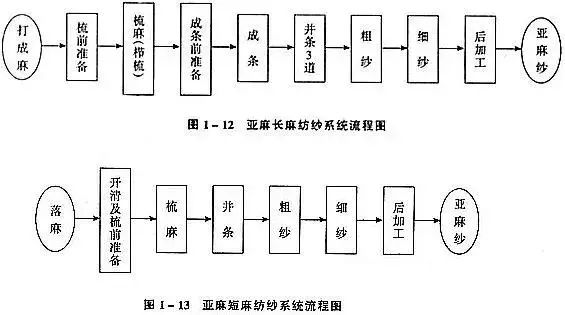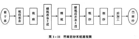 I allmänhet lånas system för kamad ull eller silkesspinning, och endast lokala förbättringar görs på utrustningen. Den råa hampan bör först förbehandlas och bearbetas till fin hampa, och dess spinnprocess visas i figuren nedan; Kort ramie och lärk kan i allmänhet bearbetas med ett bomullsspinningssystem.